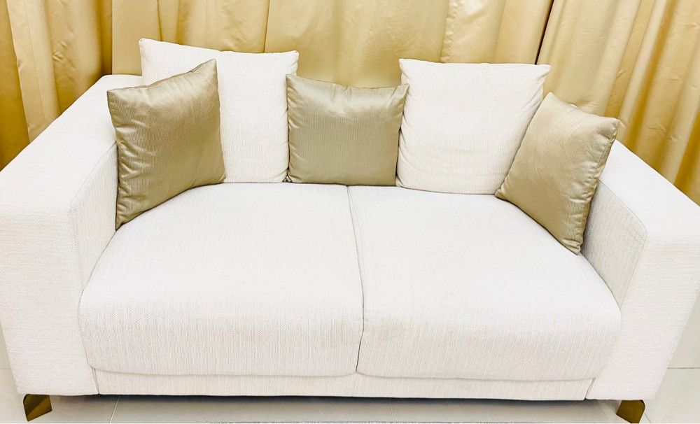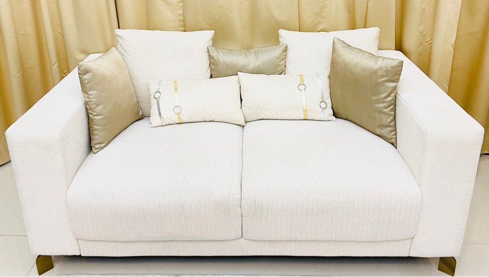 طقم كنب و وسادات شبه جديد من شركة ذا وان قطر استعمال نظيف جداً لا يوجد خدوش أو كسر. اللون: أبيض سكري (أوف وايت) يتضمن: - عدد 1 كنب كبير 3 مقاعد. - عدد 1 كنب متوسط مقعدين. - عدد 1 كنب متوسط مقعدين. - عدد 1 طاولة وسطية كبيرة خشب مع جلد. - يسع الطقم عدد 8 أشخاص الى 10. - عدد 9 وسادات صغيرة وعدد 6 كبيرة وعدد 2 مستطيلة. السعر: 4.500 ريال قطري/ قابل للتفاوض سعر الشراء: 7.696.50 ريال قطري